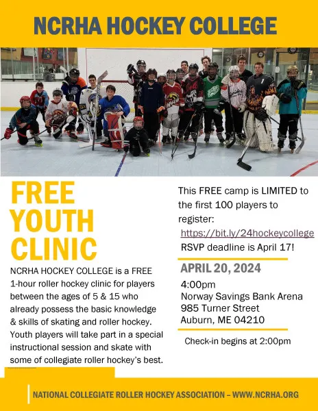NCRHA HOCKEY COLLEGE is a FREE 1-hour roller hockey clinic for players between the ages of 5 & 15 who already possess the basic knowledge & skills of skating and roller hockey. Youth players will take part in a special instructional session and skate with some of collegiate roller hockey’s best. Players to bring all their own roller hockey gear - gear is not provided. Helmets with full cages, roller hockey skates, and protective equipment are required.